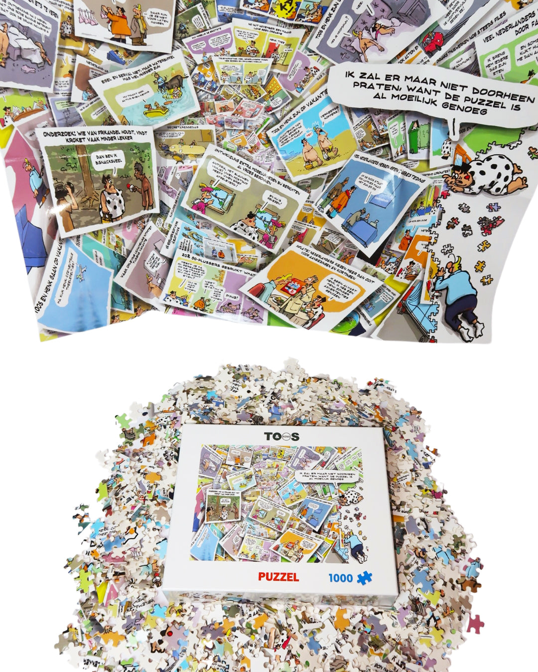 Deze puzzel is een compilatie van vele Toos & Henk-cartoons. Zo wordt ie elke keer leuker om te leggen want je ontdekt steeds weer een nieuwe cartoon.